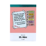 Was für ein wunderbarer Kalender! An 6 Tagen gibt es weise, fürsorgliche oder liebevolle Zitate, immer zum nachdenken, nicken oder schmunzeln……leider sinkt Mittwochs das Niveau oft ganz erheblich, dann gibt’s simple/blöde Comics und tatsächlich Sprüche wie “Stand der Dinge-Augenringe” ( z.B. am 25.6.2025)!!