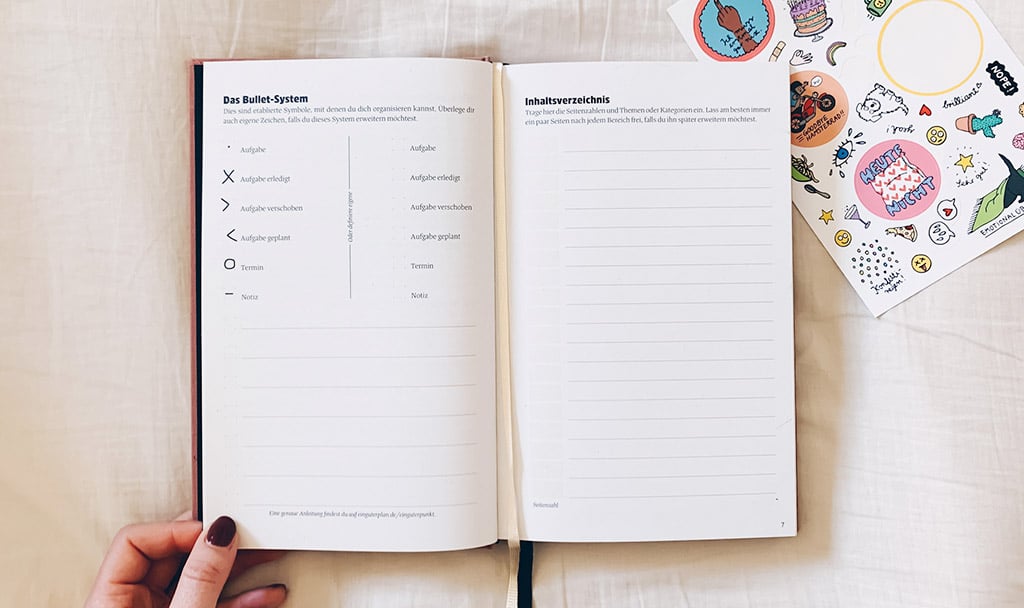 Keine Sorge, du musst dir diese Symbole erstmal nicht merken. Jan und Milena haben natürlich mitgedacht und auf Seite 6 in Ein guter Punkt direkt eine kurze Anleitung mitgeliefert. Auch einen Vordruck für das Inhaltsverzeichnis, den sogenannten Index, findest du dort. In den Index schreibst du unter anderem hinein, bei welcher Seitenzahl du einen neuen Monat begonnen hast. Oder du notierst dort die Seitenzahl einer Ideen-Sammlung, die du später noch benötigst.