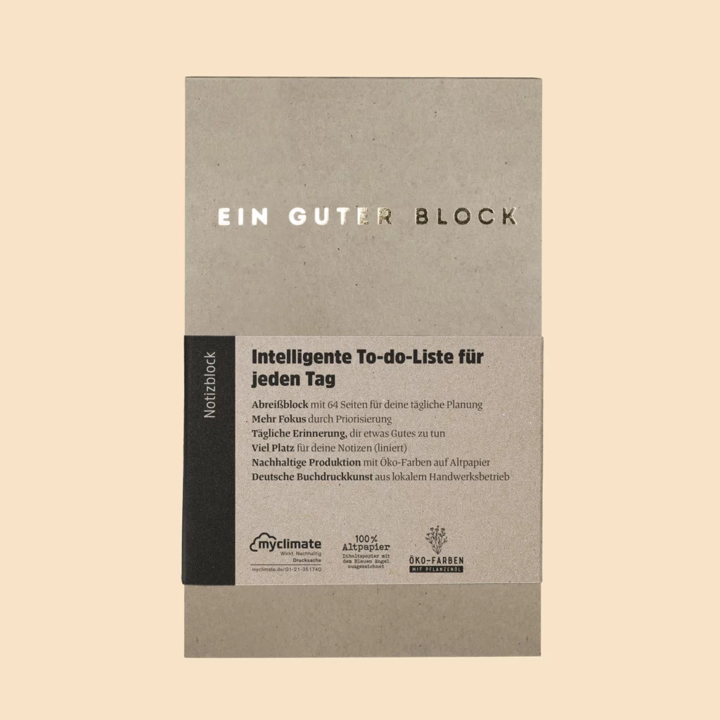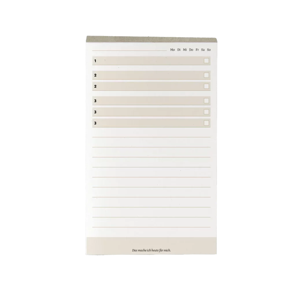 Schönes, wertiges Papier – super Strukturiert. Hilft mir ganz schnell, ohne Aufwand meinen Tag zu planen. Wunderbare Unterstützung den Kopf freizuhalten. Ersspart mir die unökologischen Klebezettel. Sehr gelungenes Konzept, sehr empfehlenswert. Danke!