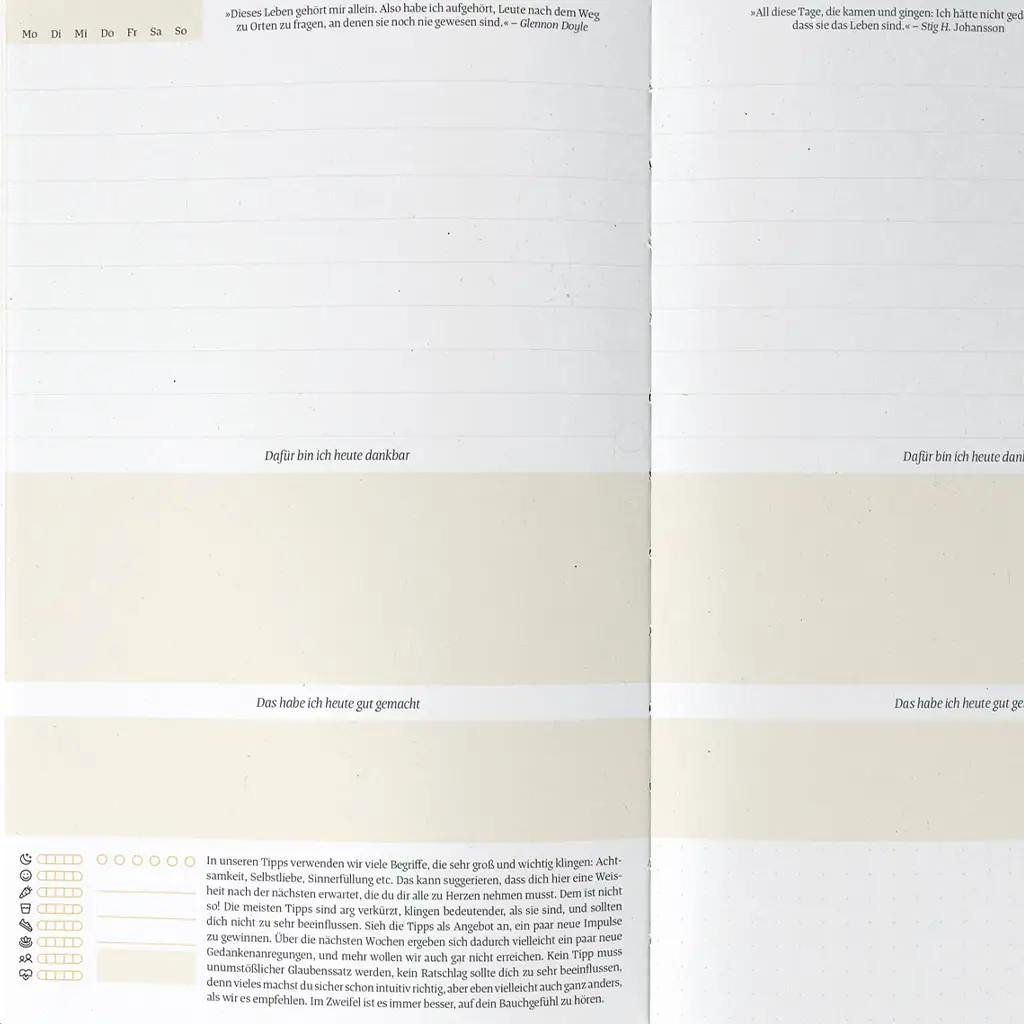 Sehr hochwertig und ein sehr schönes Design. Übersichtliche Gestaltung. Super Erklärungen für die einzelnen Bereiche. Ich kann alles festhalten und dokumentieren, was für mich von Bedeutung ist.