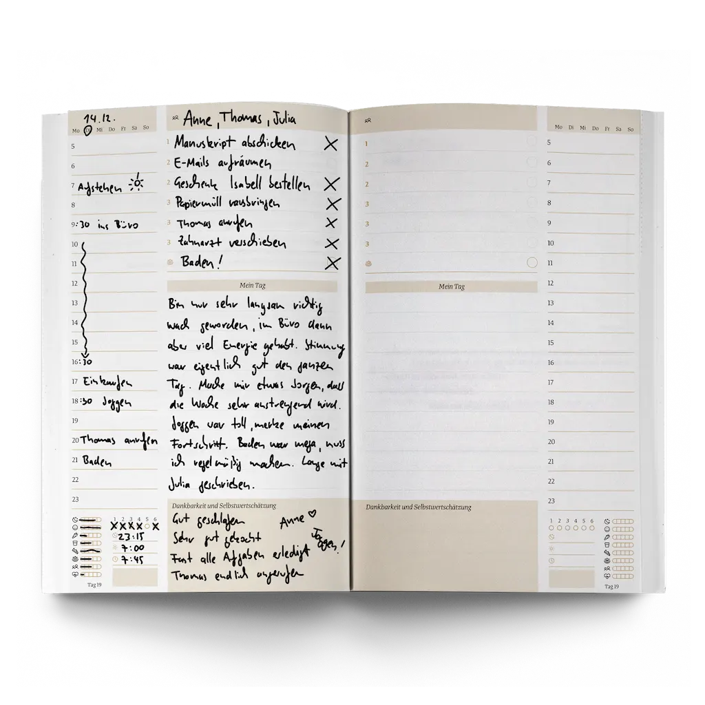 Wunderbar! Habe mir die gedruckte Version bestellt und kann nach acht Tagen sagen: ich brauche einen 365-Tage-Kalender mit genau diesem Layout der Tagesansicht! Bitte! Das wäre einfach perfekt.