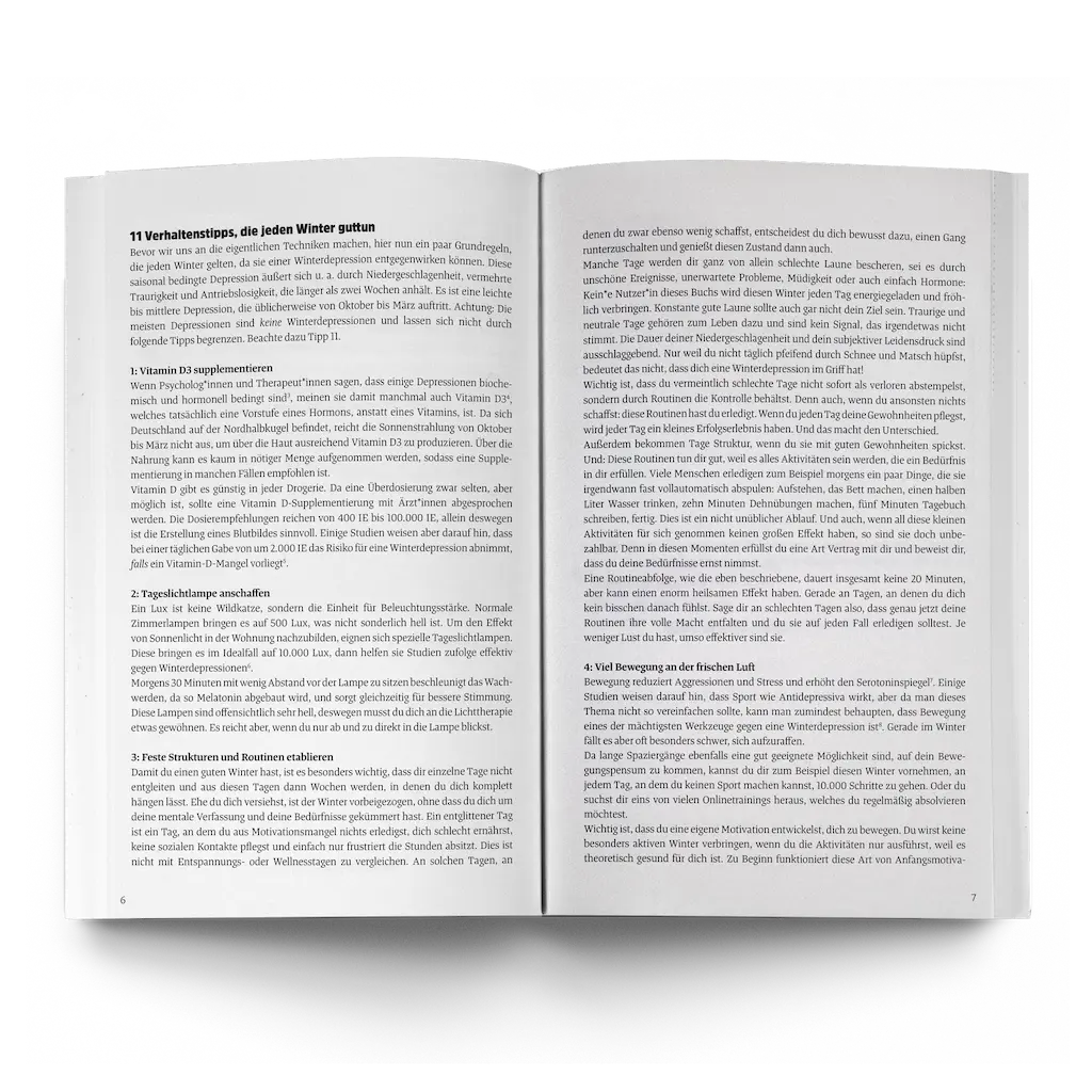 Mit Ein guter Winter stellst du dich in der grauen Jahreszeit proaktiv gegen das Grau im Kopf. Ohne Kitsch, Selbstoptimierung und esoterischem Wischi-Waschi. Und ohne Kosten, denn dieses Selbstfürsorgetagebuch ist komplett kostenlos als Download verfügbar. Aber du kannst es auch als gedruckte Version kaufen. Den Anfang machen 11 Tipps präventiv gegen Winterdepressionen.