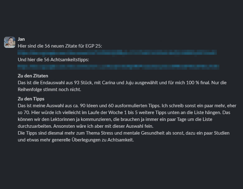 Alle Tipps und Zitate sind finalisiert und im Lektorat. Das ist schön. Diese inhaltliche Arbeit ist enorm, der Abschluss erleichtert mich sehr. Die Tipps sind dieses Mal mit mehr Fokus auf mentale Gesundheit und drehen sich häufig um eine kritische, undogmatische Herangehensweise an das Thema Achtsamkeit. Außerdem habe ich zahlreiche psychologische Begriffe erklärt, die den eigenen Wortschatz auf sinnvolle Weise ergänzen können. Abgerundet wird das Ganze von guten Studien und vielen Überlegungen über das Glück, das Leben und die Welt. Für mich ist es das rundeste Paket in knapp zehn Jahren Ein guter Plan.