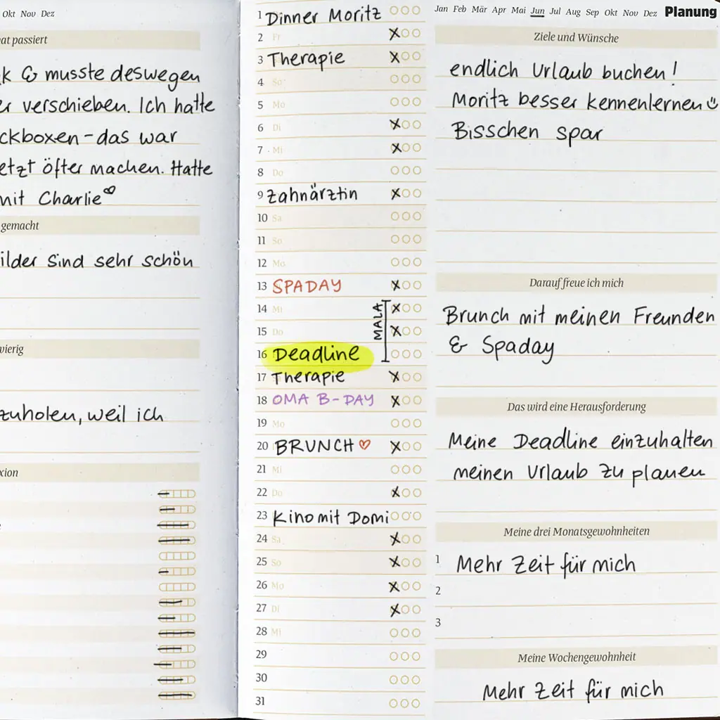 Ich lieb die Terminübersicht, den Input am Anfang und auf jeder Seite, das minimalistische Design, die Möglichkeiten für Achtsamkeit und Reflexion. Es ist mein erstes Mal mit einem Produkt von euch und ich bin so hyped!!! Und es ist so toll, dass er auch noch so nachhaltig produziert wird 😀