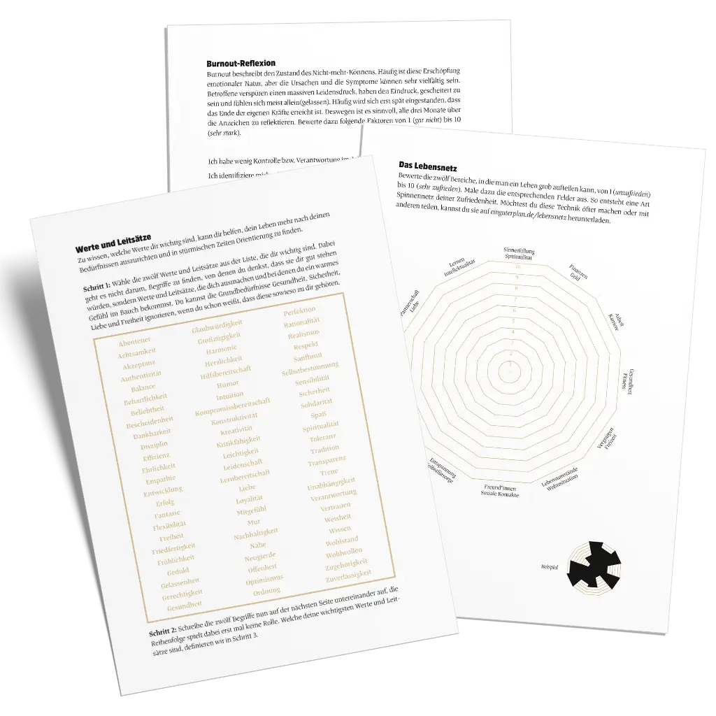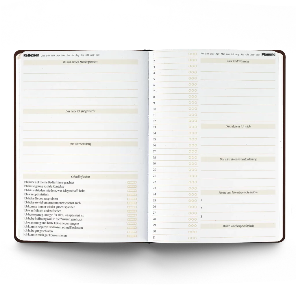 Ich finde die Übungen sehr gut, auch die täglichen Einschätzungen bieten eine gute Übersicht zur Reflexion. Ich nutze sehr viel lieber den undatierten Planer, da ich nicht regelmäßig eintrage – so kann ich in den Zeiten, wo es nötig ist, den Planer nutzen und zwischendurch gibt es einfach zeitliche Sprünge, ohne aber viele Seiten leer lassen zu müssen.