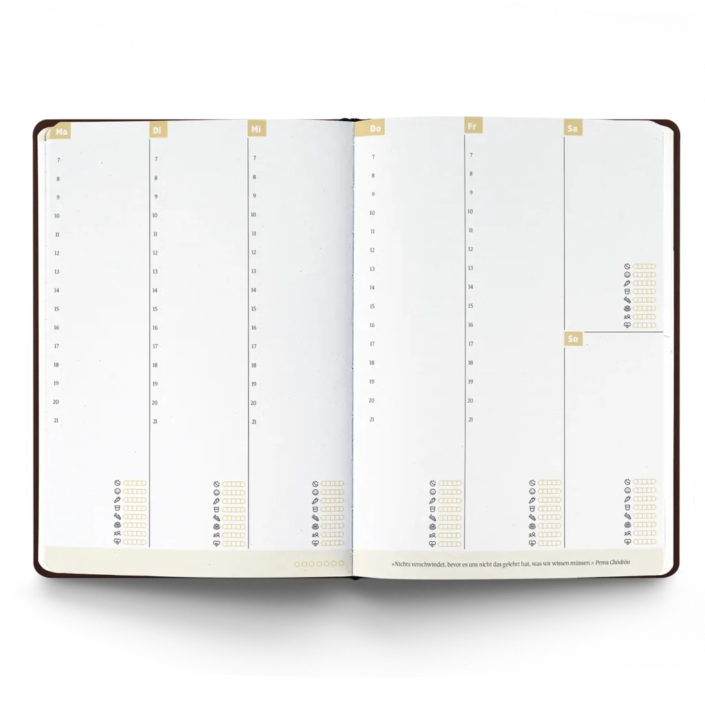 Das Design ist unschlagbar, ich liebe die Wochenübersicht mit der Zeitaufteilung und der große Platz für Notizen. Hab definitiv alle Achtsamkeitsübungen über die Jahre Mal abwechselnd aktiv genutzt.