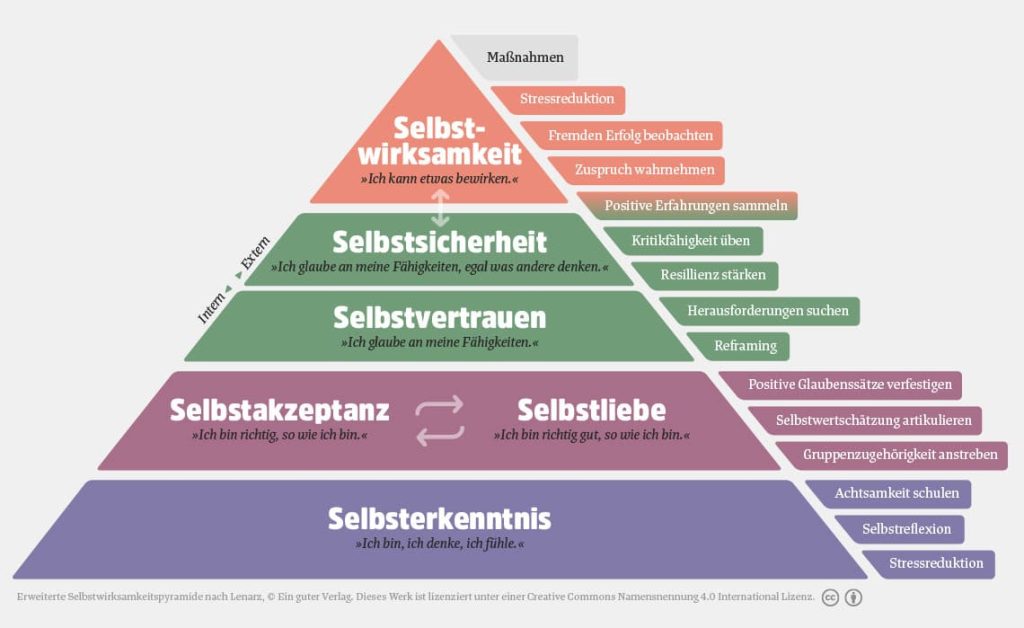 Wir haben die Selbswirksamkeitspyramide unter der Creative Commons 4.0 lizenziert. Du kannst die Grafiken ohne Anfrage teilen, bearbeiten und abdrucken (auch kommerziell).