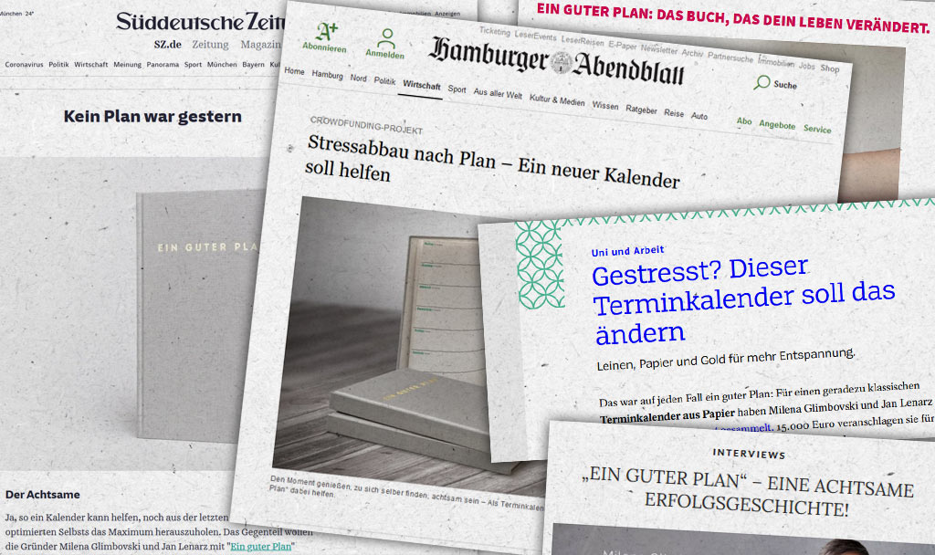 Wenige Stunden nach Start der Crowdfundingkampagne ist Ein guter Plan bereits mit 15.000 € für die geplanten 600 Bücher komplett finanziert. Mehr als das: Am Ende kommen knapp 200.000 € zusammen, 12.000 Bücher sind vorbestellt, 1.200 % Überfinanzierung. Das erfolgreichste deutsche Crowdfunding für ein Produkt bis dato. Das Medienecho ist dank Milenas Kontakten enorm. Große Zeitungen, Blogs und Radiosender berichten fast täglich. Aber so viel Demut muss sein: Die Idee war sicher nicht schlecht, aber es war auch einfach das richtige Produkt zur richtigen Zeit am richtigen Ort. 2015 war Achtsamkeit in Deutschland noch längst kein etablierter Begriff, die Gesellschaft aber bereit für dieses Konzept der Entschleunigung und Bewusstmachung.